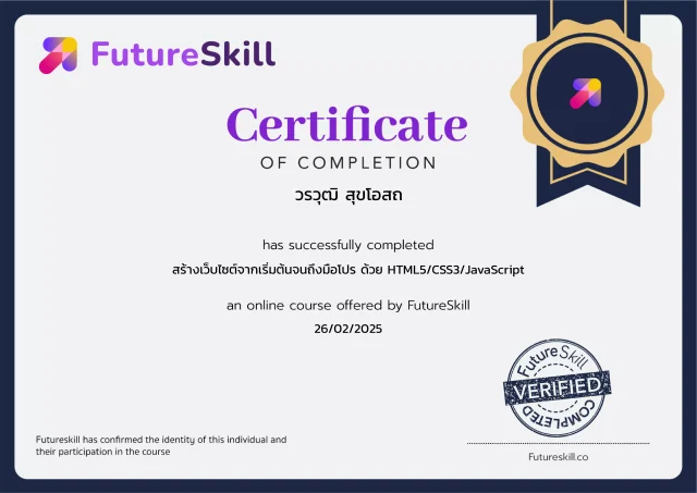 Certificate FutureSkill : สร้างเว็บไซต์จากเริ่มต้นจนถึงมือโปร ด้วย HTML5/CSS3/JavaScript worawoots2025-02-26T17:00:02+07:00 0 26 กุมภาพันธ์ 2025 CERTIFICATEPortfolio DetailsSkills: CertificateFutureSkillShareFacebook Twitter LinkedIn Google + Email