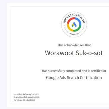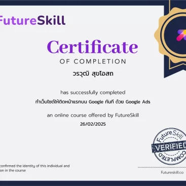 Certificate FutureSkill Google ADS : ทำเว็บไซต์ให้ติดหน้าแรกบน Google ทันที ด้วย Google Ads CERTIFICATE