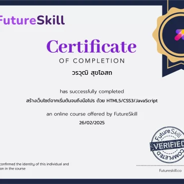 Certificate FutureSkill : สร้างเว็บไซต์จากเริ่มต้นจนถึงมือโปร ด้วย HTML5/CSS3/JavaScript CERTIFICATE